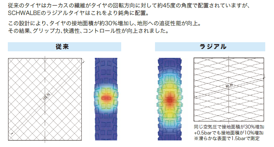まぁ、ここでRadialの定義について議論するのは不毛なのでそれはいったん預けつつこの従来よりも浅い角度でケーシングを交差させるのがSCHWALBEのいうところのRADIALであるということで納得ください。
