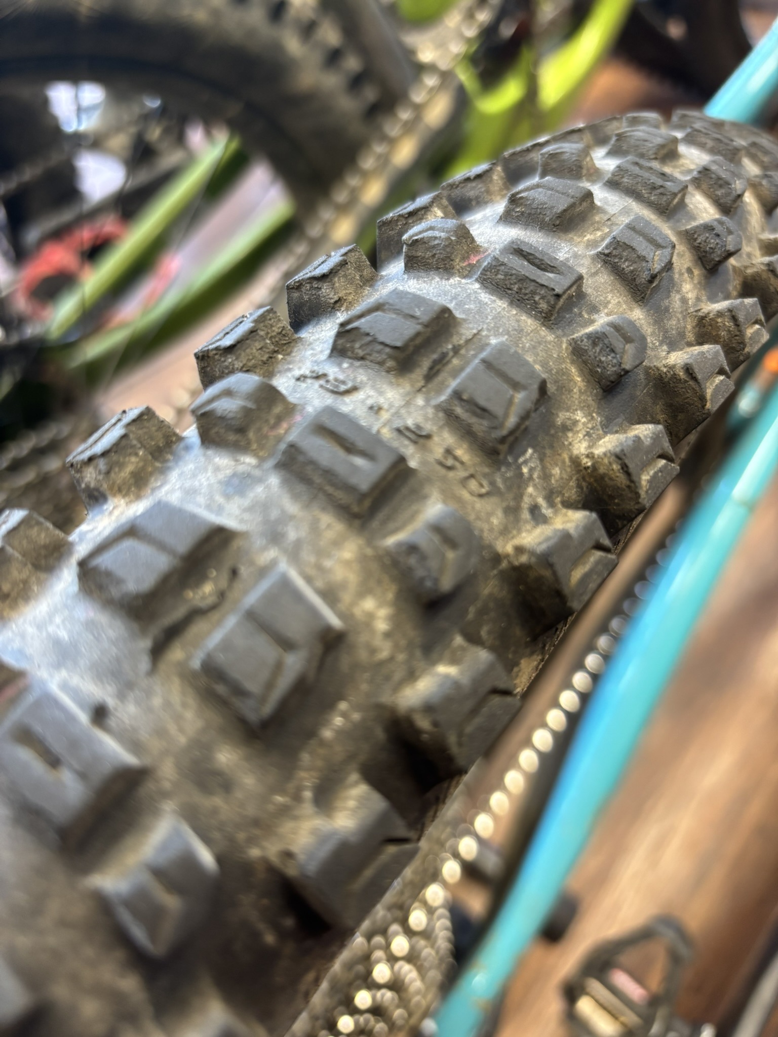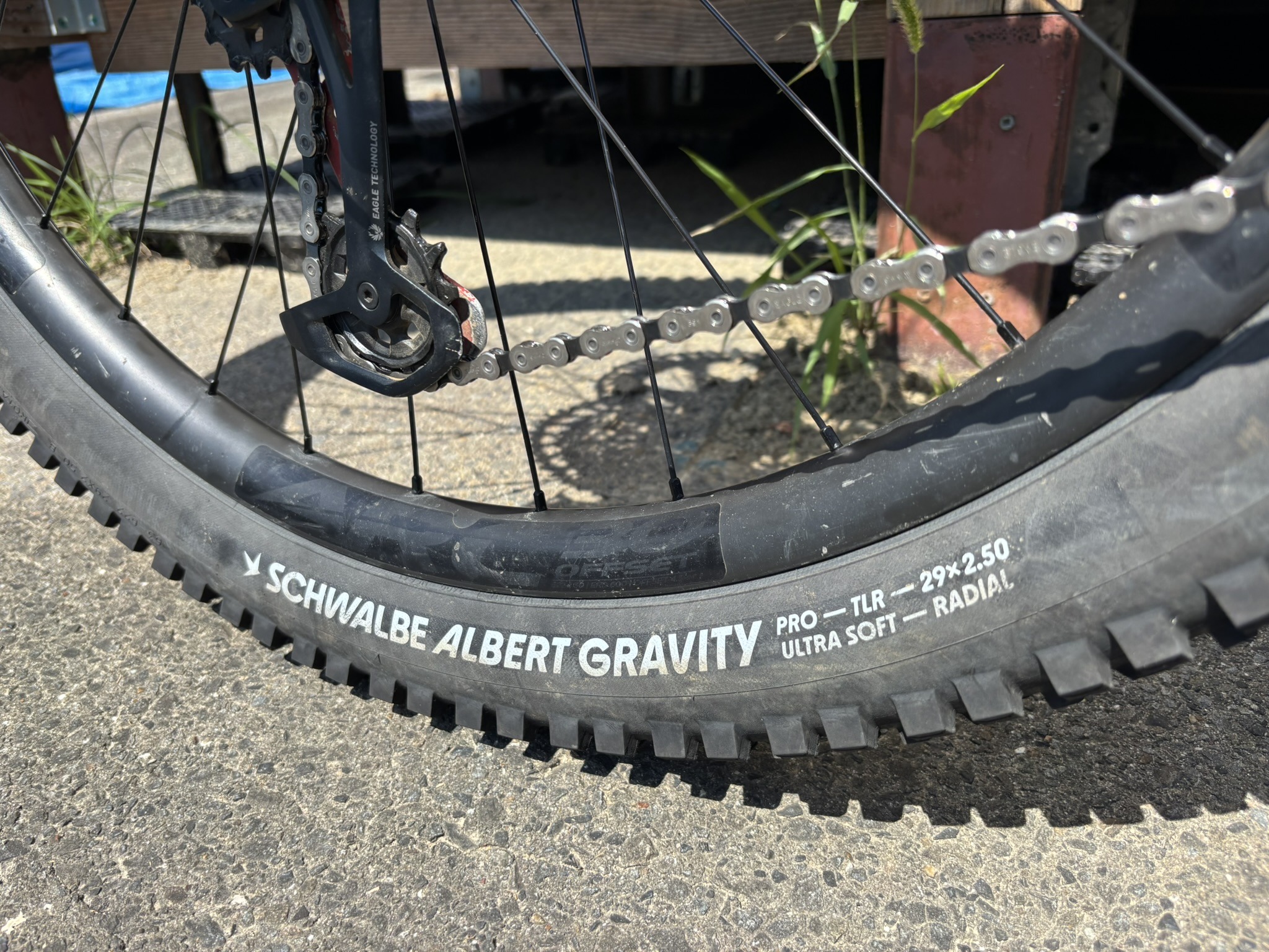 この組み合わせにするとフロントは目方が軽くハイグリップ、リアは転がりが軽く加えて過剰なグリップでカッティやルーストの邪魔をせずしかし耐パンク性能は担保する、という遊びに適した組み合わせではないかと思います。
